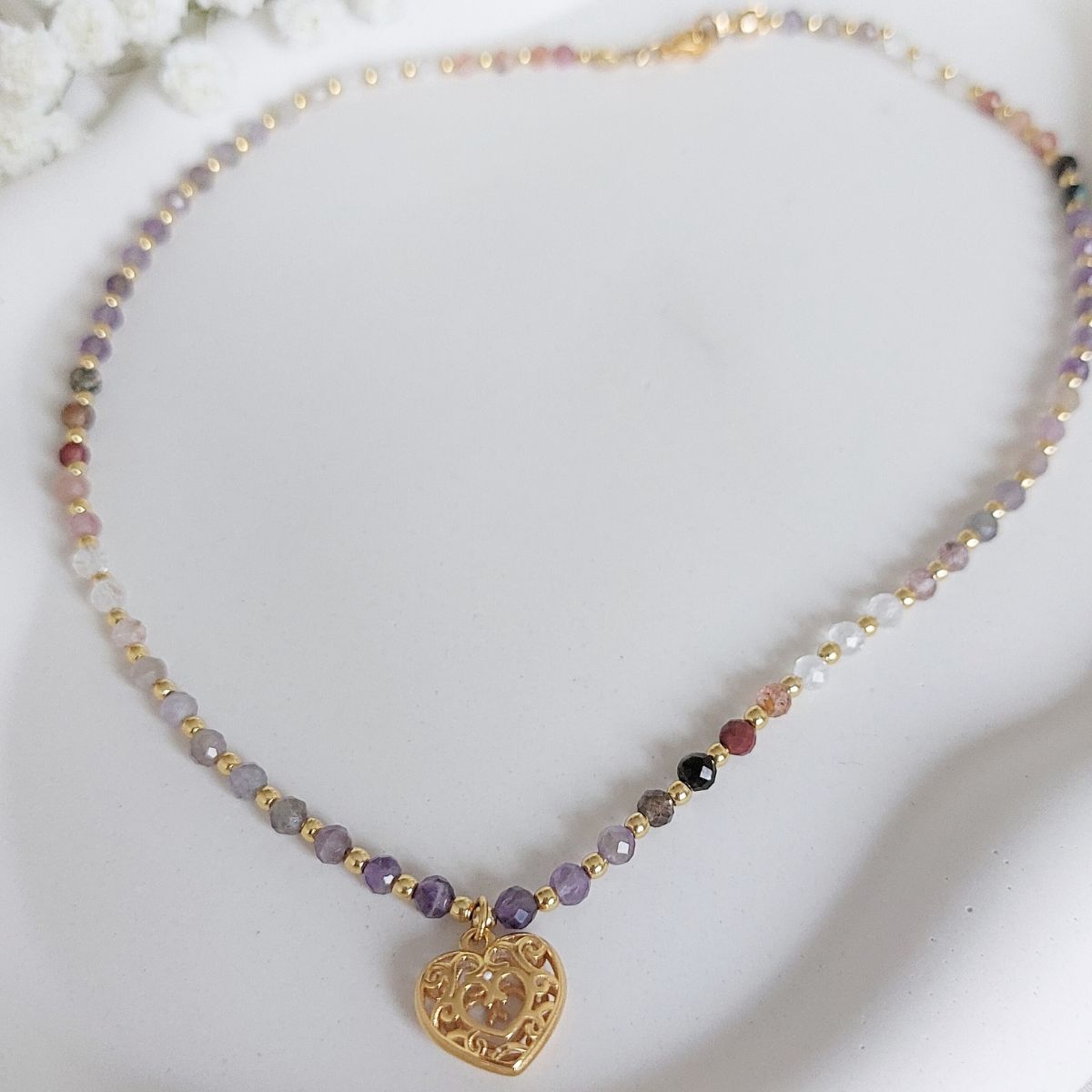 Ręcznie wykonany, wielokolorowy, oryginalny krótki naszyjnik skomponowany z przeróżnych kamieni naturalnych, przeplatanych delikatnymi, malutkimi, złotymi hematytami. Całość zdobi ażurowe, złote serduszko. Naszyjnik/czoker GOLD HEART to połączenie siły witalnej hematytu z energią innych kamieni. Delikatny, elektryzujący i kobiecy naszyjnik z kolekcji BE YOURSELF przyciągnie Cię swoim kolorem i symboliką.