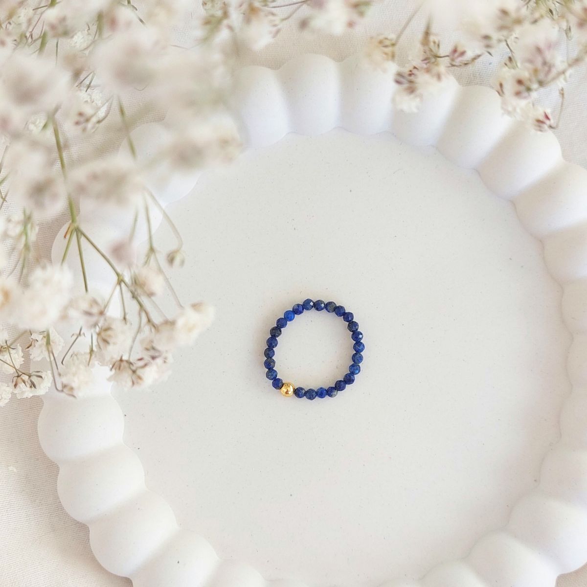 Delikatny, drobny, niezwykle minimalistyczny pierścionek z elektryzującego lapis lazuli. Tu w towarzystwie jednego, nieco większego hematytu. Idealnie sprawdza się w zestawach po kilka pierścionków lub noszony do obrączki.