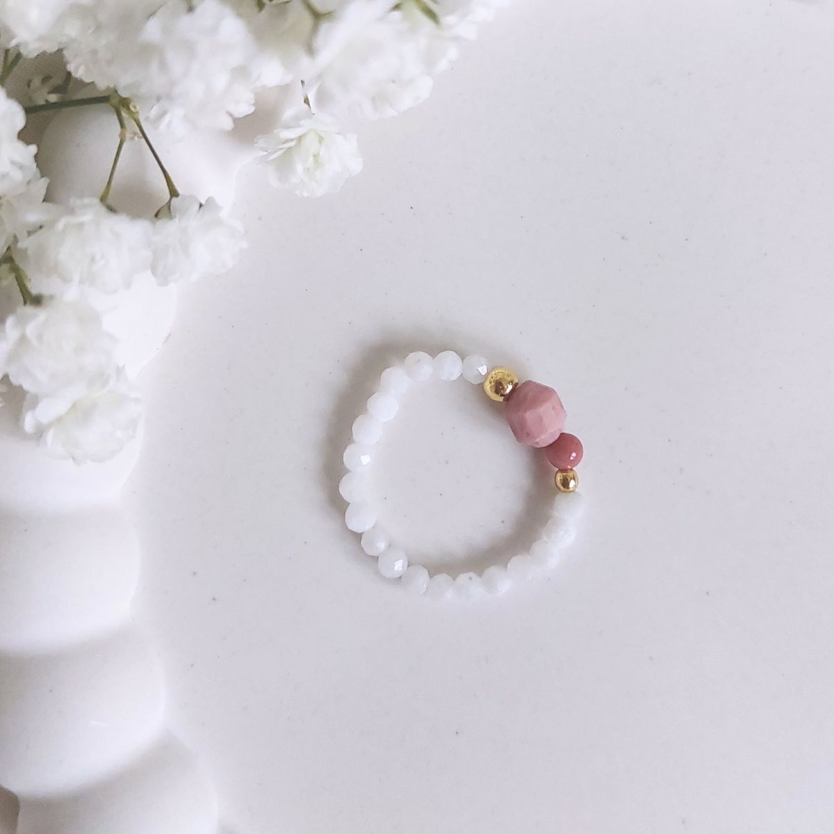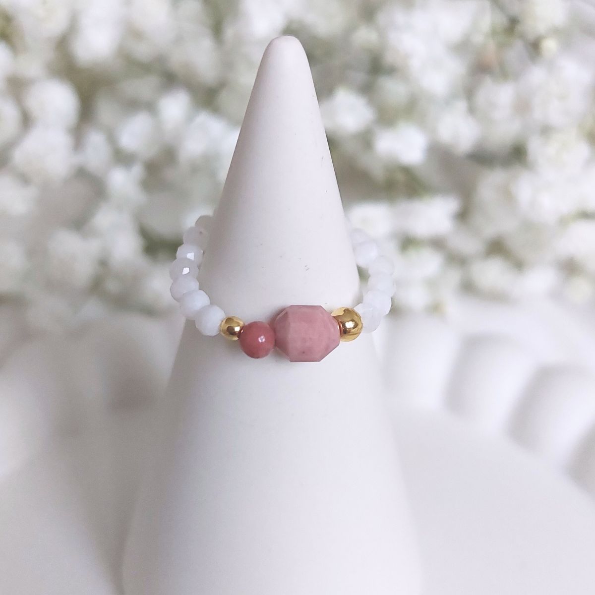 Delikatny pierścionek elastyczny o bardzo kojących, kobiecych wibracjach. Skomponowany z rodonitów, kamieni księżycowych i hematytów o delikatnej energii, dla kobiet, które potrzebują ukojenia i miłości.