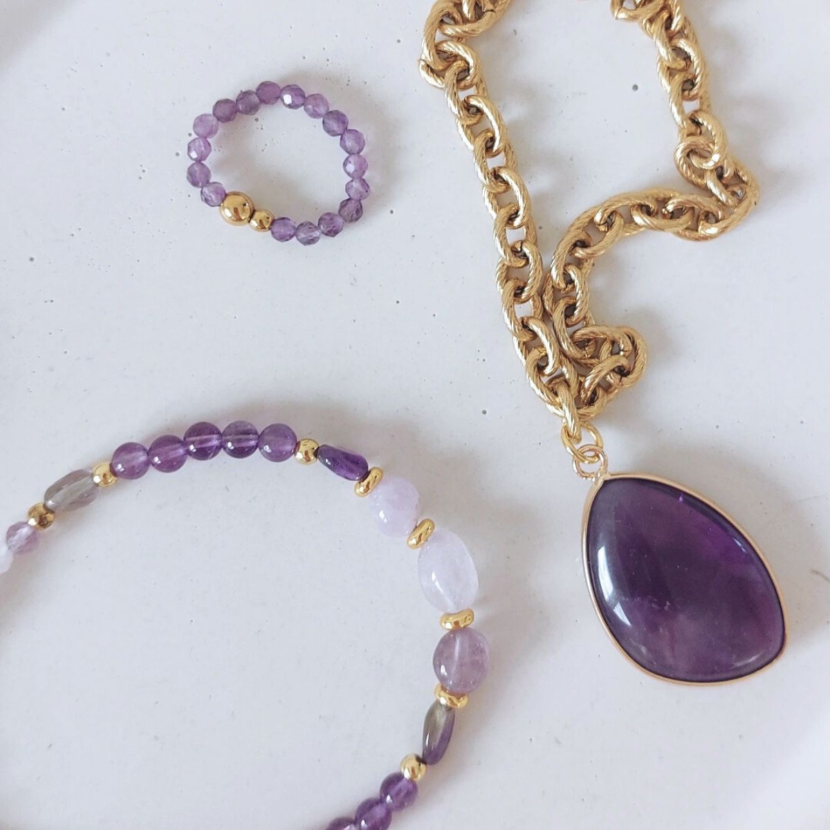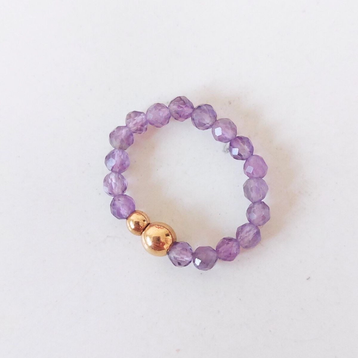 Bardzo prosty, delikatny pierścionek elastyczny z ametystów, które okalają 2 złote hematyty. Dla każdej kobiety, która szuka spokoju, ale i pragnie obudzić swoje życie seksualne. Ametysty bowiem pobudzają fantazję. Również w łóżku.