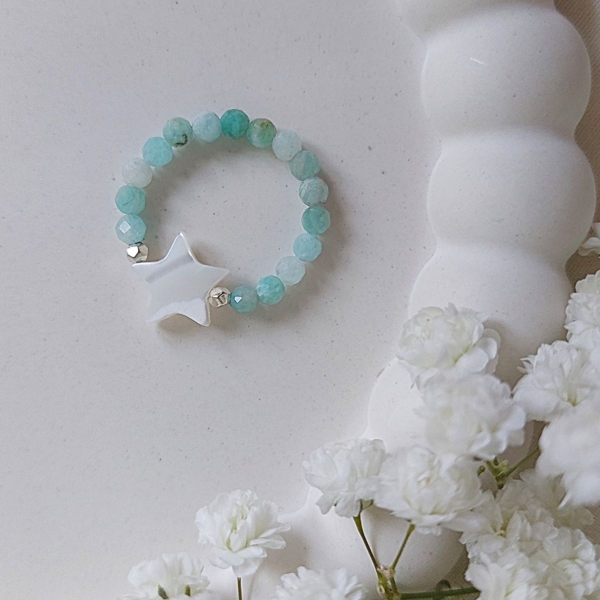 Delikatny pierścionek na żyłce elastycznej z masą perłową w kształcie gwiazdy oraz amazonitów i srebrnych hematytów. Pomoże Ci zalśnić nawet w najbardziej pochmurny dzień.